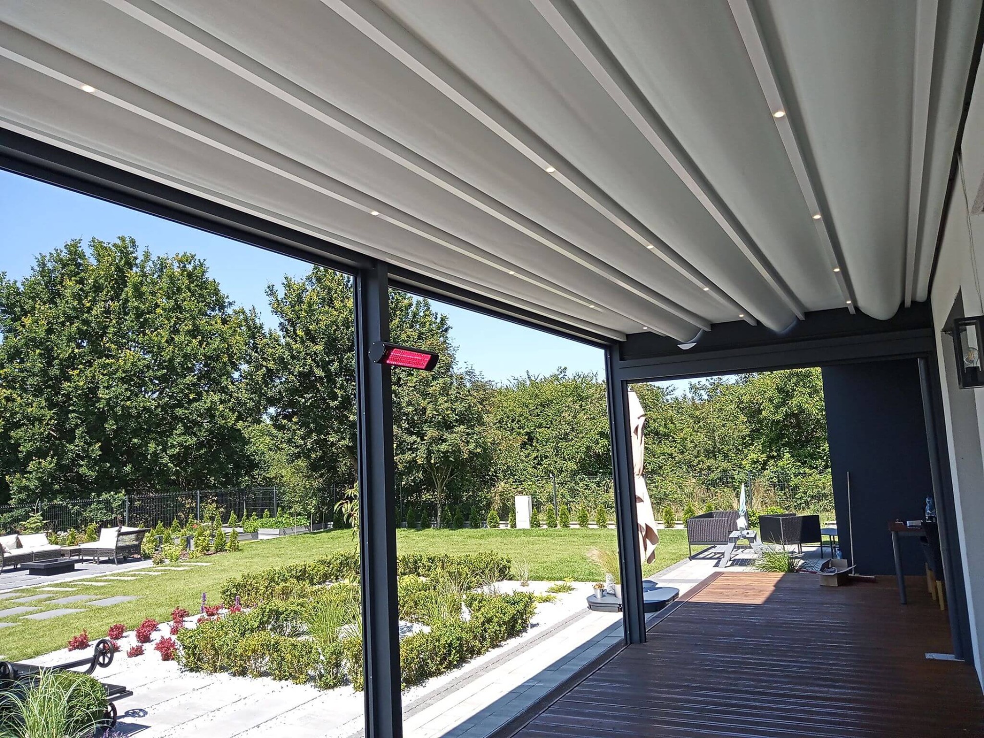 S naší pergolou Elegant vás nemusí trápit zbytečné zastínění prostoru. Pokud se pergola nevyužívá jednoduše střechu stáhnete čím dovolíte pronikat slunci na terasu.